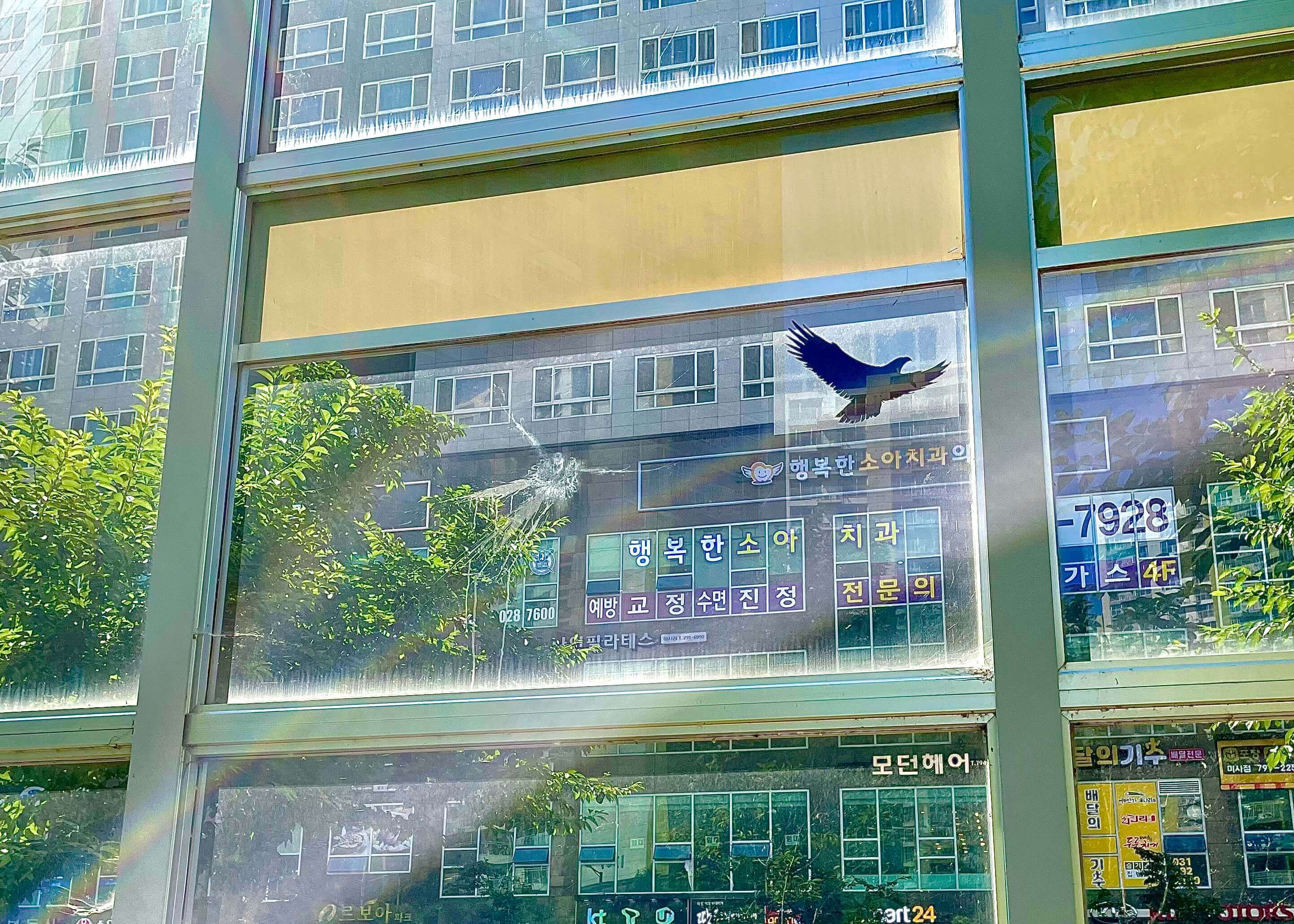 조류는 비행 시 일정 크기 이상으로 넓은 틈을 통과하려 하지 않는 특성이 있습니다. 이를 이용해 유리창 표면에 점이나 선 패턴을 일정 간격으로 표시하면 새가 그 공간을 ‘열린 곳’이 아니라 막힌 장애물로 인식하게 됩니다.